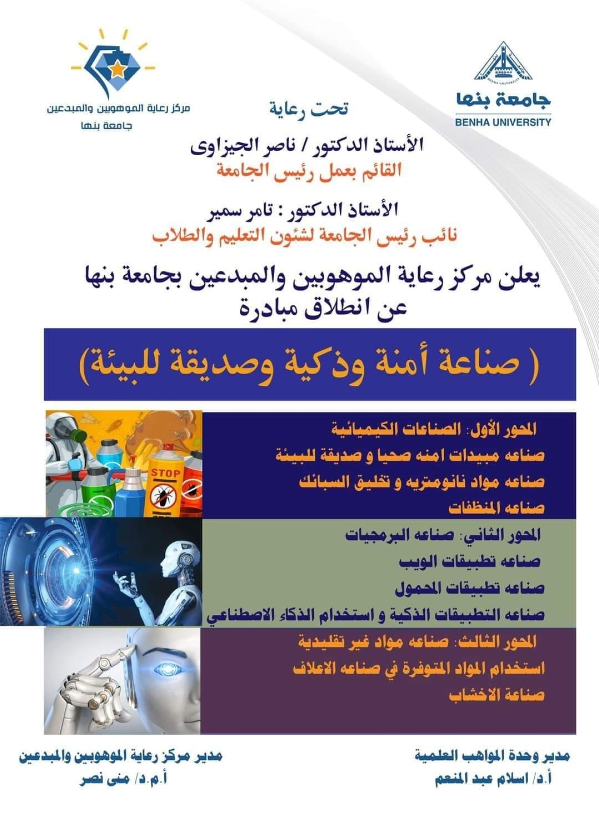 و اشراف الدكتورة / مني نصر مدير مركز رعاية الموهوبين والمبدعين بجامعة بنها ، والأستاذ الدكتور / اسلام عبد المنعم مديروحدة المواهب العلمية تعلن وحدة المواهب العلمية بمركز رعاية الموهوبين والمبدعين عن انطلاق مبادرة (صناعة آمنة وذكية وصديقة للبيئة) للاشتراك بالمبادرة :